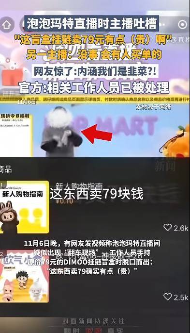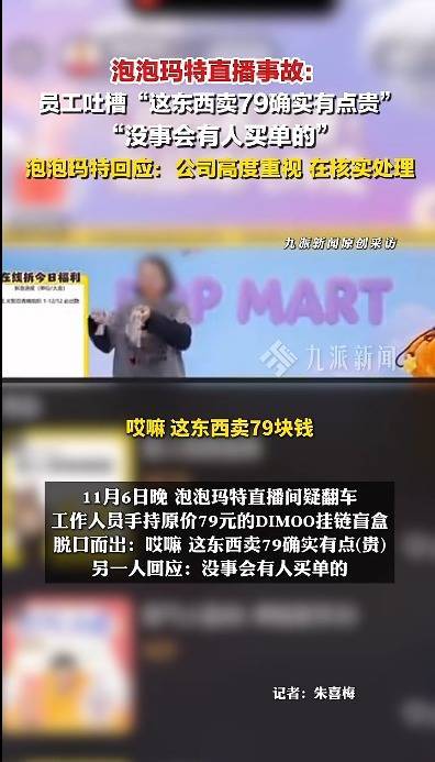 11月6日,有网友发现泡泡玛特在抖音平台的官方旗舰店直播时出现直播事故,一工作人员拿着dimoo原价79块挂链盲盒说“哎嘛,这东西卖79确实有点”,另一个工作人员说“没事会有人买单的”。11月7日上午,泡泡玛特方向封面新闻记者回应称:“确实发生了直播事故,公司正在紧急调查,但不会开除直播事故中相关员工。”