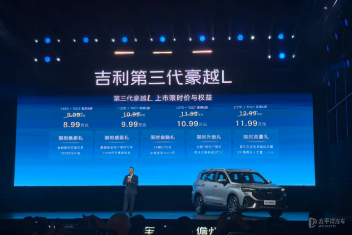 11月27日,吉利汽车旗下中型SUV——新款豪越L正式上市,四款车型的售价区间为9.99-12.99万元,上市限时价8.99-11.99万元。新车轴距2825mm,提供5/6/7座可选,内饰换装全新14.6英寸悬浮式中控屏,搭载FlymeAuto智能座舱系统,动力上提供1.5T和2.0T两款发动机可选,最大功率分别为133千瓦和160千瓦。
